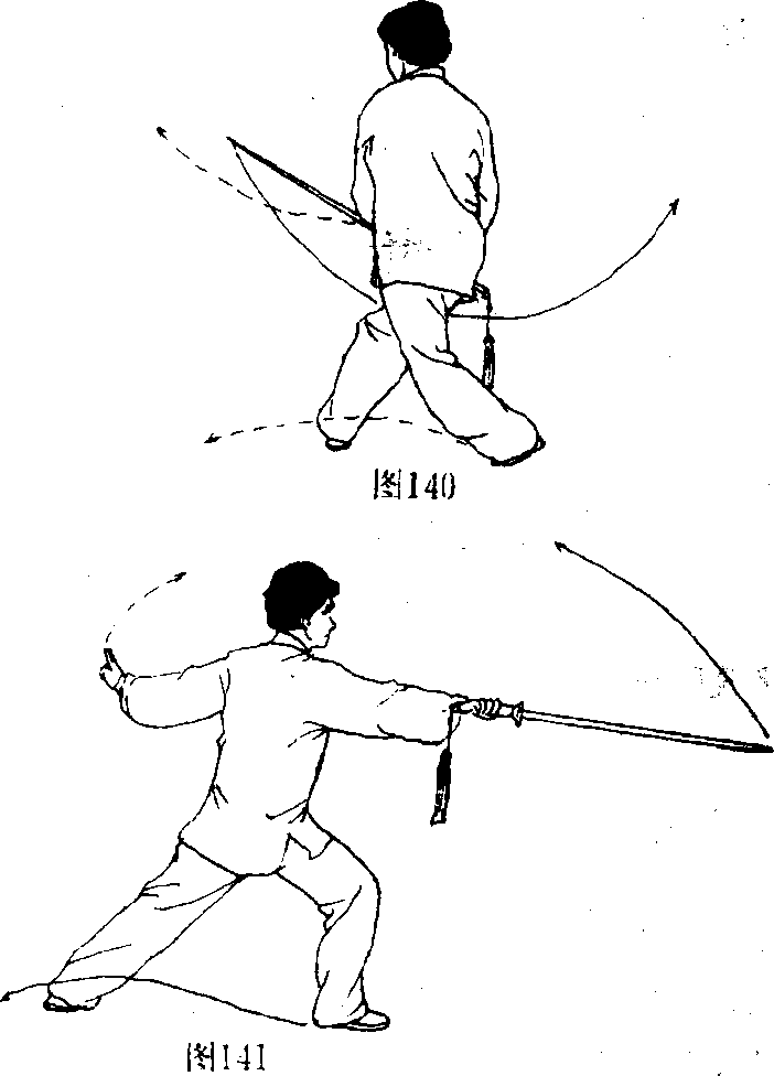 步;同时,右手握剑经下向右反撩,腕同胸高,手心向 后;左手剑指经下向左划弧摆举至肩平,目视剑尖。 (图 141)