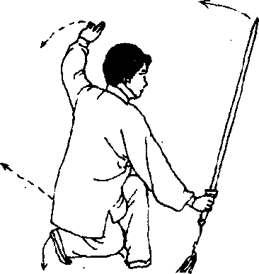 右脚掌向右踱转踏实并屈膝半蹲,身体重心前 移,上体右转,左脚跟提起成叉步;同时,右手握剑翘 腕后带至右胯旁,剑尖向左上方,左剑指落附于右腕 上”手心向下。目视右前下方。(图140)