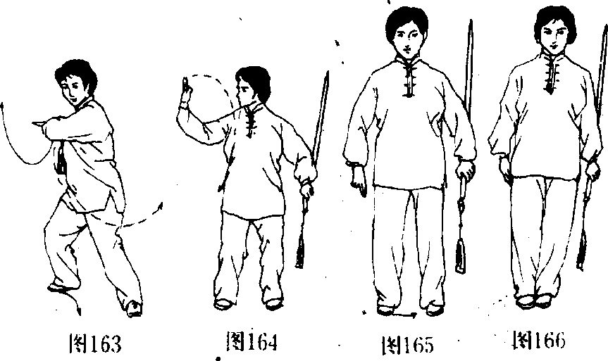 两腿自然伸直,同时右手剑指经胸前向下落于身 体右侧,然后左脚向右脚并拢,身体自然站立,两臂垂 于体侧。目视前方。(图165.166)