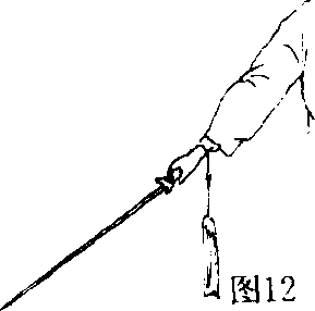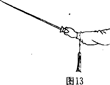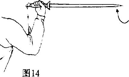 平剑,手心向上,以腕关节为轴,使剑尖由右向左 作逆时针小立圆绕环,力达剑身前部(图IDo图H(十二)截剑剑身斜向上或斜向下为截,劲达剑身 Wo上截 剑斜向上;下截剑斜向下(图12)。(十三)带剑平剑,由前向左(右)屈臂回抽为带,腕高不过胸, 剑尖斜向前,劲贯剑身中、后部(图13)。(十四)托剑.立剑,剑身平置,由下向上为托。手心向里,腕与 头平,劲贯剑身中部(图14)。
