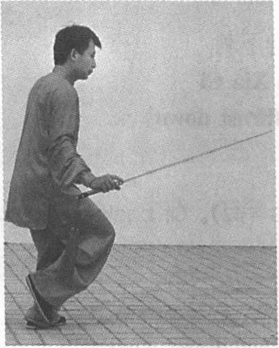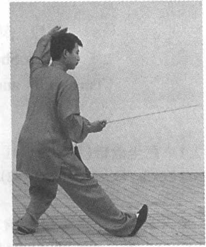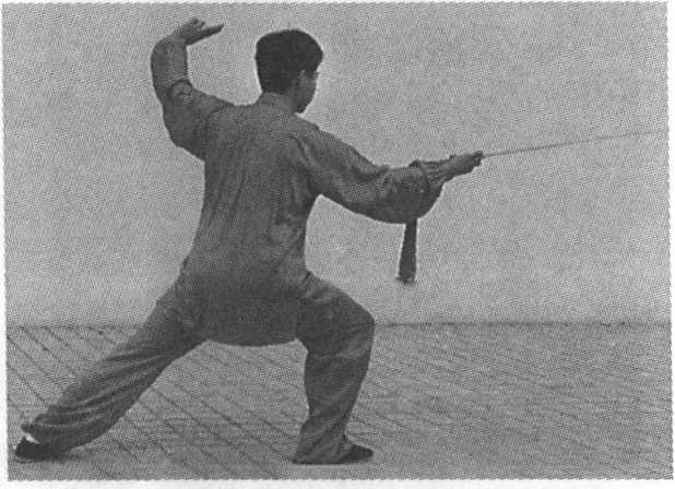 Bow stance and thrust sword (Fig.3-39~3-4O).要点:刺剑时顺肩前送,要有力撑八面之劲。Key points: Move your shoulders forward when thrusting the sword with an expanding force on all sides.93一3g-Fi93一3 图83-3g- ?1 F 83一3 图403图