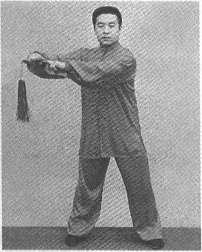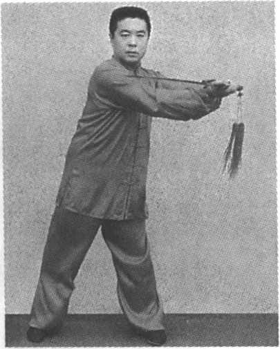 Key points: The movements of the lower limbs are similar to that of the advancing step. Use the waist to steer the movement of the wrist and sword circling forward.