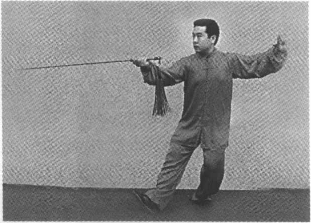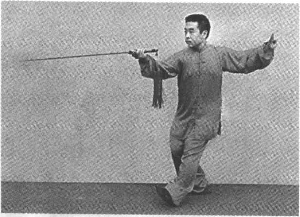要点:下肢同进步,剑、手在腰的带动下,螺旋前进。