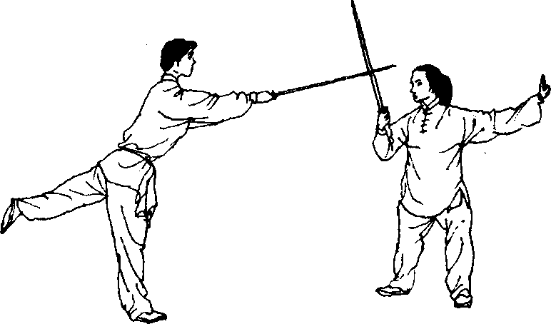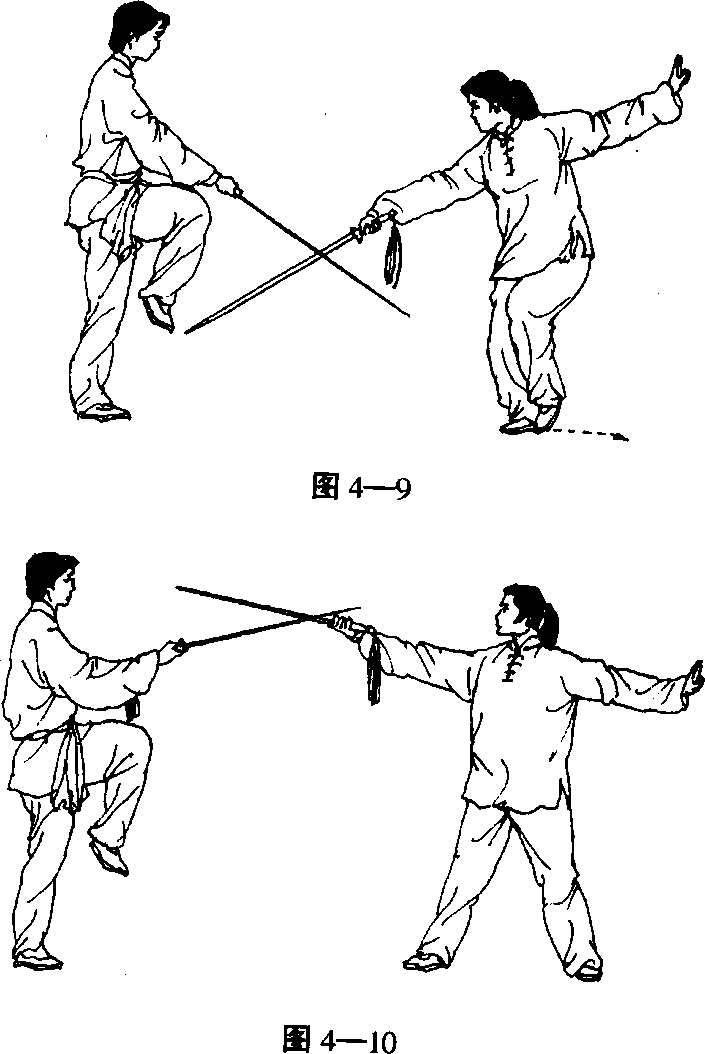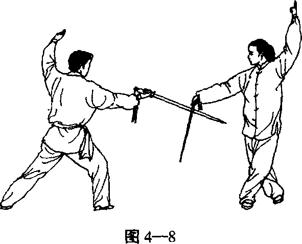 甲方右脚向前上步成右弓步,同时用剑向乙方 裆部撩击;乙方右脚迅速向后退步,同时用剑由左 向右拦截(图4—8)。