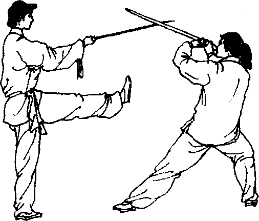 甲方用右脚向乙方胸前蹬击,同时用剑向乙方 面部刺击;乙方迅速右转身,同时右脚向右侧方退 步成弓步,并用剑上架来剑(图4—11)。