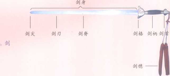 剑由剑身、剑格、剑柄、剑首等部分构成 身又分为剑尖、剑刃和剑脊。