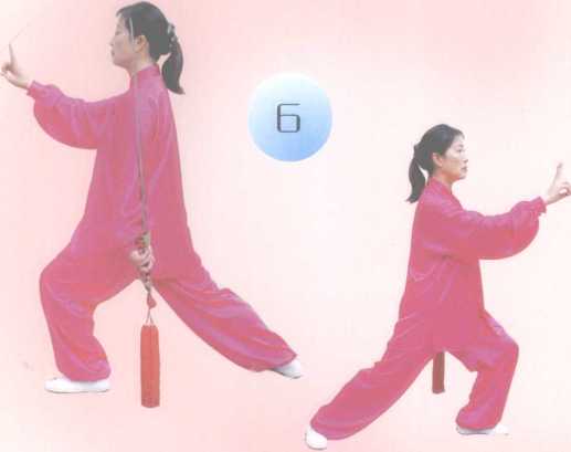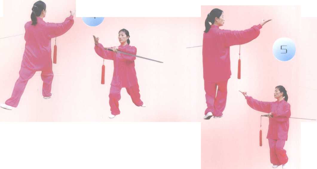 右脚跟后侧,脚尖轻着地;同时右手 剑指向右前方呈瓠形伸展,左手持剑 屈肘下行至右胸前,手心向下,眼视 剑指。