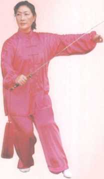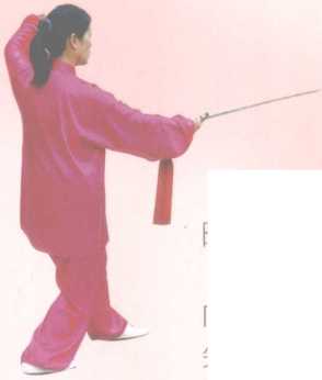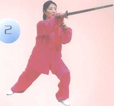 穿剑时,要松胯拧腰, 两膝微屈;向右走行步要沉 稳,走得圆,不要有起伏;剑 尖微向右,有崩格对方来剑 之意,眼神要跟随。整个动 作攻防、观赏都相宜。