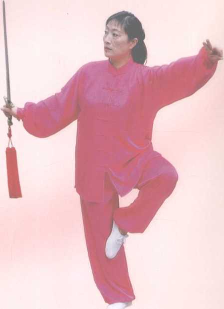 右腿踏实,身彳市起立,左腿屈膝提起,高 于左腹前,脚尖下垂,成右独立步,上身 稍向右转;同时右手握剑屈肘向上侧举, 腕低于胸,剑身斜置于右肩上方,手心斜 向前,左手剑指下落与肩同高,手心向左, 指尖斜向上,眼视右前方。