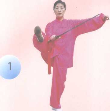 身体重心前移,左腿起立,成左浊立步,右服 提起脚面伸平脚尖向上,经左向上向右摆踢, 脚面高于右腕外侧;同时右手握剑,前臂内旋 经面前使剑尖在头前方沿逆时针划瓠屈肘向 左,左手剑指仍分举左侧,眼视前方。