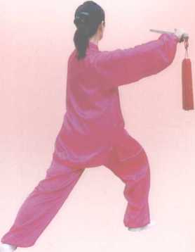 右腿向右前方落步前弓,身仙微向右