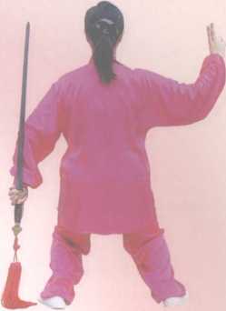 1 左服屈膝,右腿屈膝下落收 至左膝旁;同时右手握剑下 落至胸前,左手剑指由左前 划瓠至胸前与右手握剑相 , 台,屈肘咐于右腕内侧,手 ■ 心向下,眼视剑前。