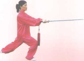 ?带剑:平剑,由前向左或向右屈臂回抽带,腕高不 过胸,剑尖斜向前,力达剑身。