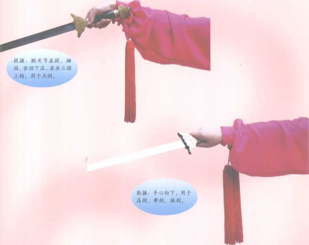 剑有长短、轻重、软硬之分。剑长有26寸(约87厘 米)、28寸(约93厘米)、30寸(约100厘米)、32寸(约107 厘米)几种。剑重有1斤(500克)、1.2斤(600克)、1.5斤 (750克)、3斤(15()0克)几种。软剑剑身薄,有弹性,能 弯曲扎在腰间,藏而不露;硬剑剑身厚,无弹性,但锋 利,能削铁如泥。故在选剑时,应根据练剑者自身的情 况而定。在选购时可将剑从剑鞘中抽出,剑尖轻点地面, 竖直,剑首高应与自身肚脐的位置相齐;或将剑调头, 五指握住剑的剑格处,手臂向下伸直,剑身向上贴住手 臂后侧,剑尖与耳朵上缘相齐,为合适长度。