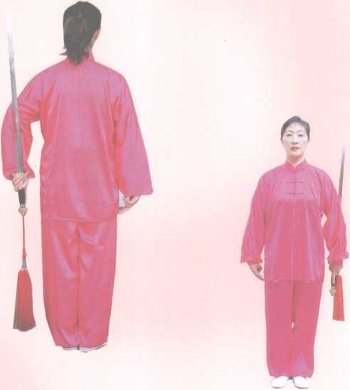 身依自然直立,全身放松,两脚尖向前,脚跟靠拢。左 手握剑下垂,略外开于身偷左侧,臂要圆撑,手心向后, 剑身竖直紧贴在小臂后面,剑尖向上;右手剑指下垂, 手臂靠近大服外侧,手心向里,眼向前平视。