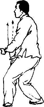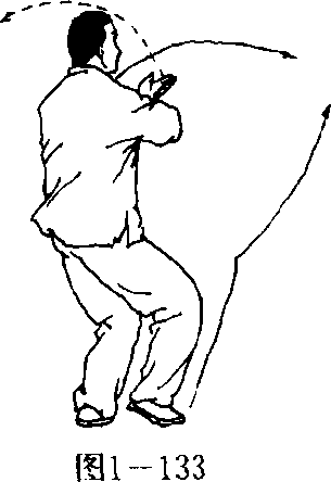 ①左腿屈收下落,身 体以右脚掌为轴顺势向右 后转身,左脚尖随体转内 扣落地;两掌从两侧向腹 前划弧下落,前臂外旋,掌 心斜相对;头随身体转动 (图 1—132)O