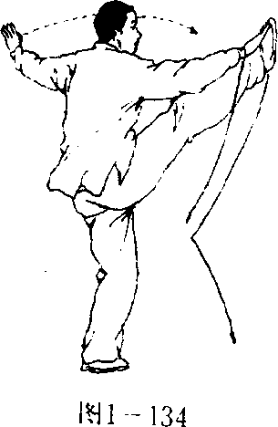 ③左腿支撑,右脚向 上踢摆、脚面展平;两前臂 内旋,掌心转向外,右掌向 前击拍右脚面,高与头齐, 左掌向后划弧分开,平举 于身体左方,腕高与肩平; 目视右掌(图1—134)。