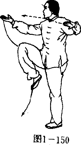①左脚蹬地;左腿微 屈站稳,右腿屈膝提起,脚 尖下垂,成左独立步,右掌 翻转上托,举于体前,掌心 向上,腕高与胸平,左掌向 左、向上划弧,撑于体侧, 腕高与肩平,掌心向外,指 尖斜向上,目视右掌(图 1—150)。