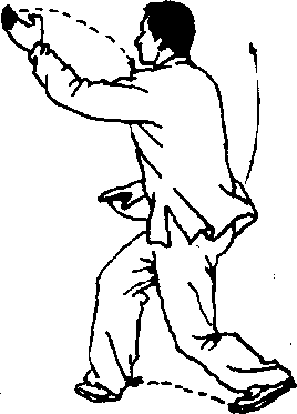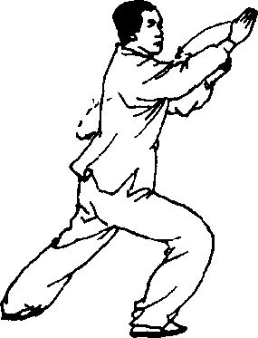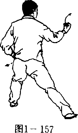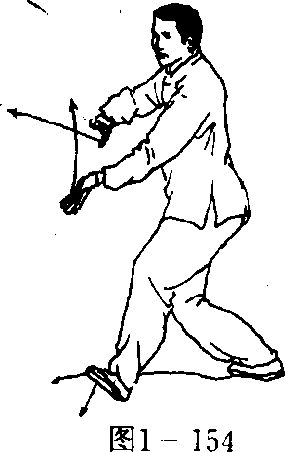 图 1—156图 1—156③右脚前掌为轴,脚 跟外展,身体左转,右腿屈 弓,左脚后撤一步,脚尖外 展落地;两掌随转身向左 平捋至体前,右掌高与头 平,左掌置于右肘内侧,两 掌心斜相对;目视右掌(图 1—156)。