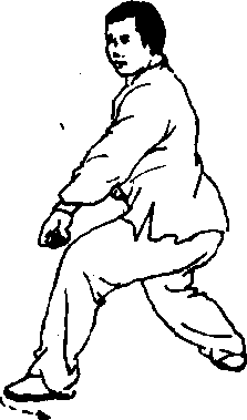 图1一 153图1一 153③上体左转,左脚向 左前方上步,重心略向前 移,成半马步,左臂内旋, 摆至身体左侧,向前靠出, 左拳拳眼向内,拳面向下, 置于左膝前,右掌屈收,经 耳侧推助左臂向前挤靠, 掌心向左,掌指附于左上 臂内侧;目视左前方(图 1—153)O