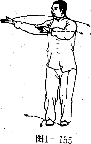 ②上体左转,重心前 移,右脚收于.左脚内侧,两 脚平行向前,重心仍偏于 左腿,并稍向上升高;左臂 内旋,左掌屈肘提至胸前, 横掌掌心向外,右臂外旋, 举于身体右侧,高与肩平, 掌心向上;目视右掌(图 1—155)o