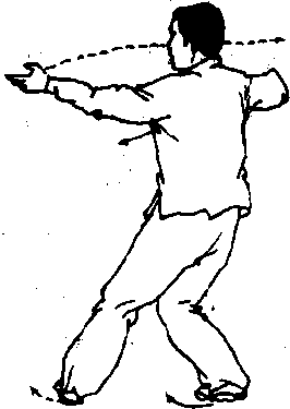图1一169图1一169①左脚前落,脚跟先 着地,脚尖内扣,上体右 转;右臂内旋,右掌翻转向 下,屈肘向右平带,左勾手 变掌,掌心转向上,自后向 前平摆至体侧;头随体转, 目视前方(图1—169)。
