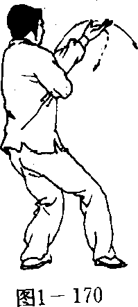 ②以两脚前掌为轴, 向右后转体:左掌摆至体 前,掌心向上,高与头平, 右掌翻转向上,经胸前及 左肘下方向左穿出;头随 体转,目视前方(图1- 170)。