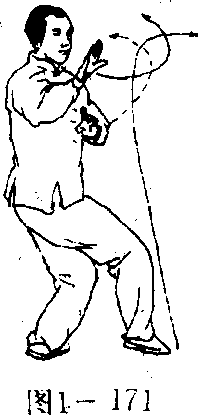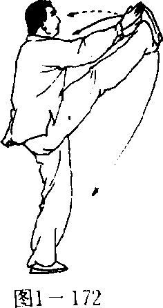 ④右脚提起向左、向 上、向右作扇形外摆,脚面 展平;上体左转,两掌自右 向左平摆,在头前左先右 后依次击拍右脚面;目视 两掌(图1—172)。