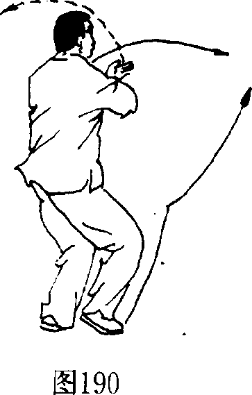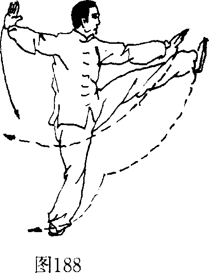 3 ,右脚面展平向上踢摆;右掌击拍右脚面,左掌 侧举。(图191)