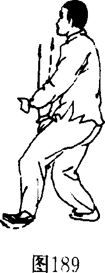 左腿屈收,以右脚掌为轴右后转体,左脚内扣落 步;两掌向腹前下落,掌心斜相对。(图189)