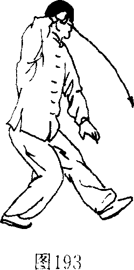 1 .落脚转体右脚外摆向前落步,重心前移,上体右转;左掌屈 臂右摆,右掌翻转掌心向上落于腰间。(图192)2 .上步提拳左脚向左上步,上体微左转;左掌向下划弧落于 腹前;右掌向右、向上握拳提于右耳侧;目视前下方。 (图 193)图192图192