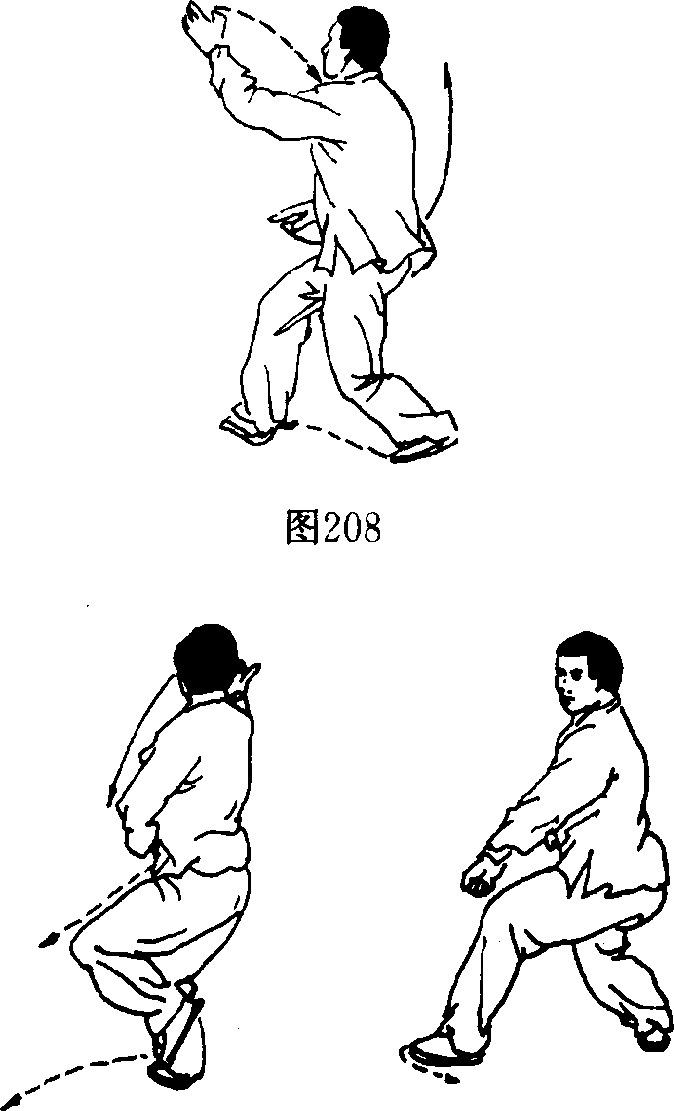 (1)右脚向前落步支撑重心,左脚向左前方上成 半马步,重心仍偏于右腿。