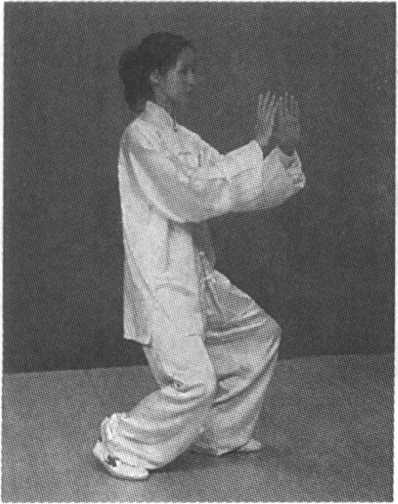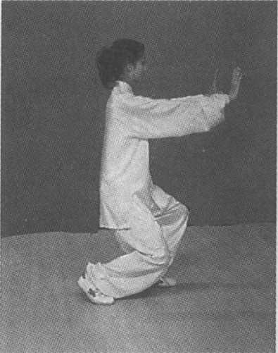 Key points: Drop your groin and push your right foot against the floor. Shift your weight while pushing the palms forward in an