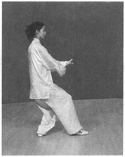 要点:转身时,先松右胯下沉,然后左腿松落,转腰带 动身体转动,右脚跟不可高抬。