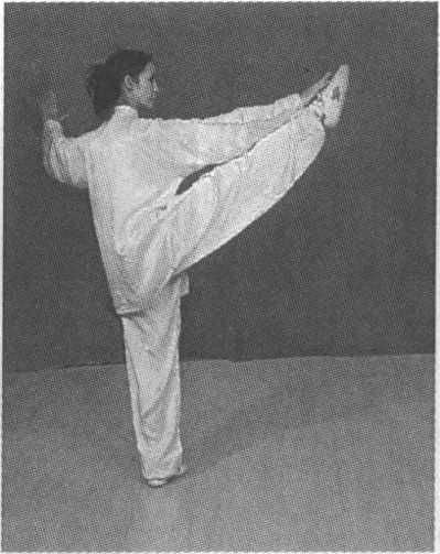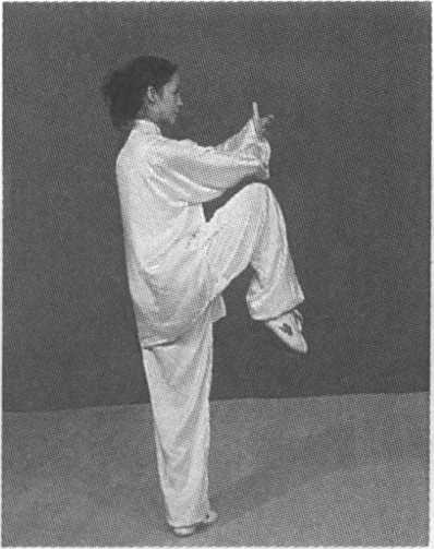 Key points: Use your waist to steer the movement of raising the right leg to meet the right hand. Relax the right palm to slap the right instep.