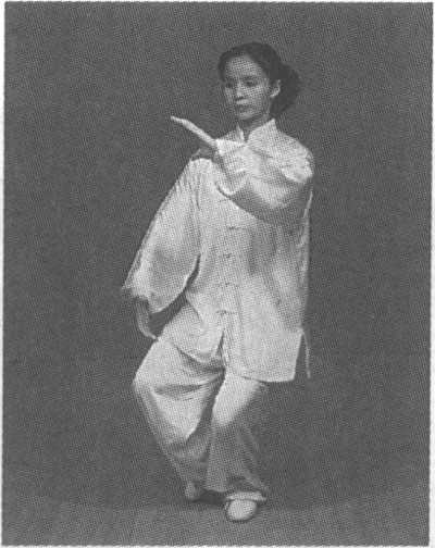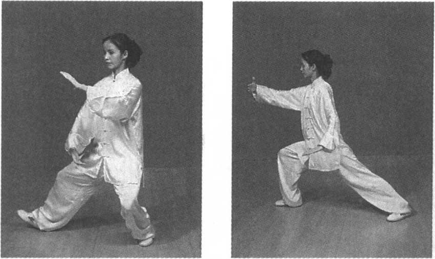 Key points: While stepping the right leg toward, draw the left hip in and don't bend the right knee over the toes or inward. Coordinate the movements of making the right leg in bow stance, warding off with the left arm and relaxing the waist . When completing the movements, drop your groin and hips withuWei Lu” drawn forward in, pull and straighten the back, breathe confort- ably and hold the force.
