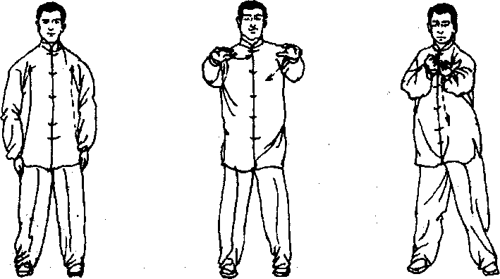 (1) 上体微右转,两手臂外旋,左掌心向上, 右手握拳屈肘合于胸前,拳心向上,目视左手(图