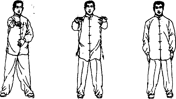 (3)左手臂前伸,两掌心向下,高与肩平,同 肩宽,目视前方(图3—84);两腿慢慢伸直,两手 臂自然下按于身体两侧(图3-85) □