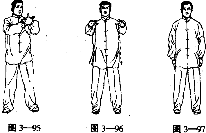 (7)两臂前伸,手心向下,高与肩平,同肩宽; 两腿慢慢伸直,目视前方(图3—96),两手臂慢慢 下按于身体两侧(图3—97)O