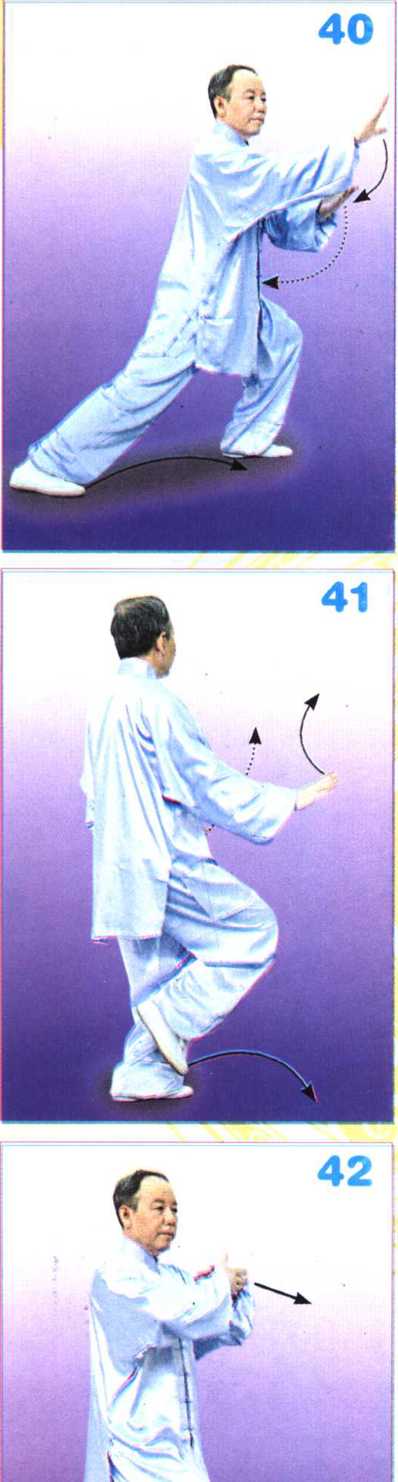 重心稍后移,左脚尖内扣,上体右 转;左拳变掌,右掌向右划一平弧,随 即收于左前臂内侧。(图39)