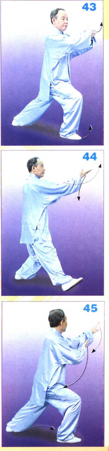 ①转体扣脚幅度不要超过45度,后移重心也不宜过大。后手随 之稍向后收引划一小弧。