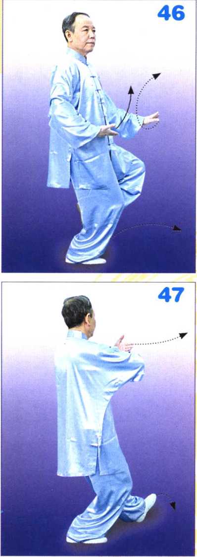 左脚向左刖方上一*步,脚跟着地; 同时右前臂内旋,左前臂外旋,两手翻 转屈臂上举收于胸前,手心相对;目视 前方。(图47)