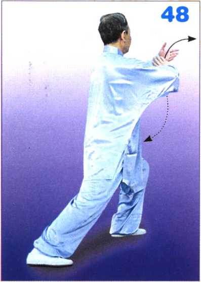 重心前移,成左弓步;两臂同时向 前挤出,两臂撑圆,右掌指贴于左腕内 侧,掌心向外,指尖斜向上;左掌心向 内,指尖向右,rWi与肩平;目视左掌。 (图 48)