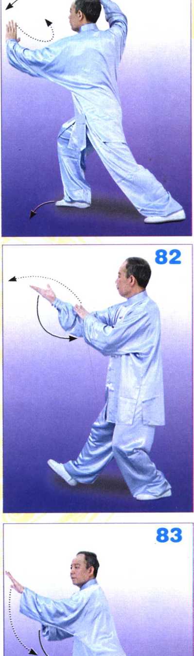 重心前移,右脚落实,上体继续左 转;左掌从右前臂上穿出,并自右向左 划弧抹掌;右掌收于左肘内侧下方,两 掌心上下斜相对;目视左掌。(图83)