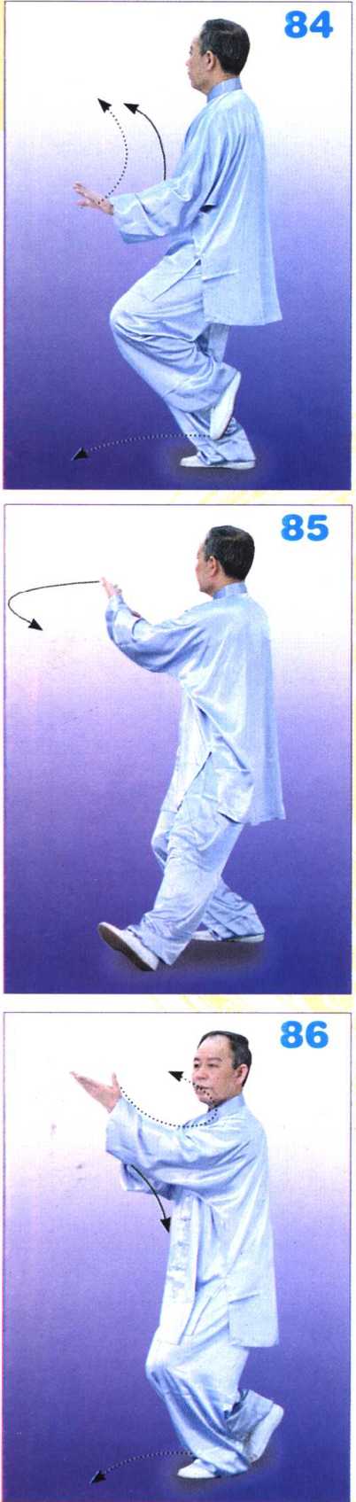 重心前移,上体左转,右脚随之跟 至左脚内侧后方,脚前掌着地;左掌自 右向前划平弧,掌心转向上,右掌随之 转动;目视左掌。(图86)