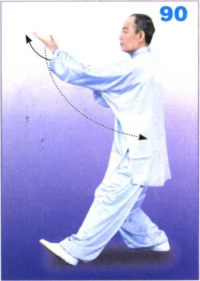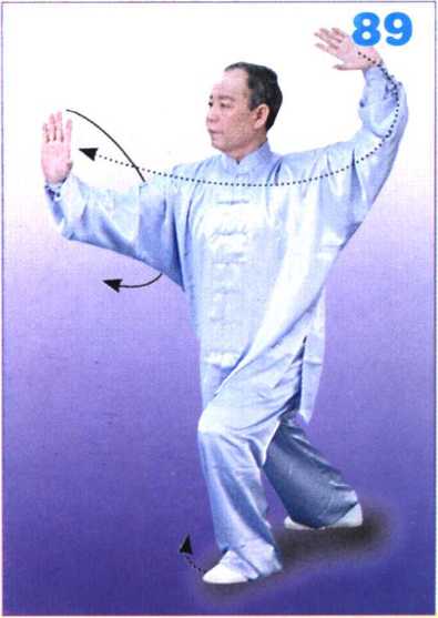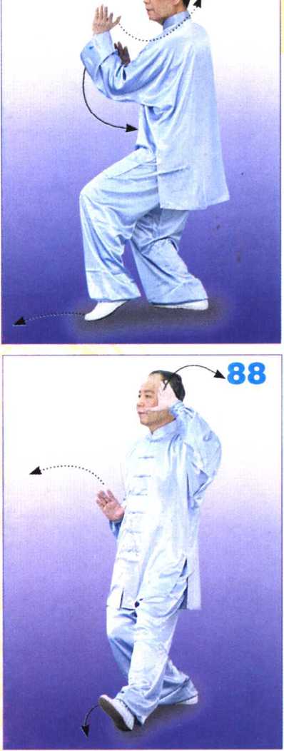 上体左转,左脚再向左前方上一 步,脚跟着地;左掌内旋翘腕至左肩前 上方,掌心斜向上;右掌随之划弧后收 于右腰际;目视前方。(图88)