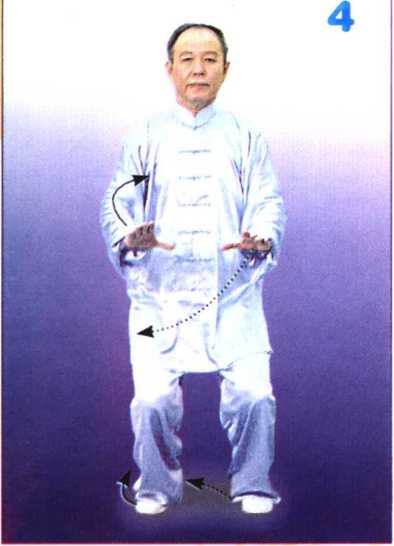 上体保持正直,两腿缓缓屈膝半 蹲;两掌轻轻下按,落于腹前,掌与膝 相对。屈坐时弯腿落胯,屈膝屈雕敛 臀,肛门收缩上提,保持上体中正,屈 坐高度因人而宜。动作完成时身体好像 端正坐在椅子上,两手轻按在腹前桌子 ±o体重落于两脚后半部。(图4)