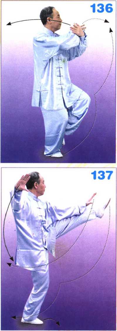 右腿微屈站稳,左腿屈膝提起,左 脚尖向左前上方(与起势方向成90度) 慢慢踢出,脚面展平,高过腰部;两掌 向左前和右方划弧分开,掌心向外,腕 与肩平,两臂撑举,肘关节微屈,左臂 与左腿上下相对;目视左掌。(图137)
