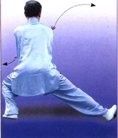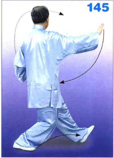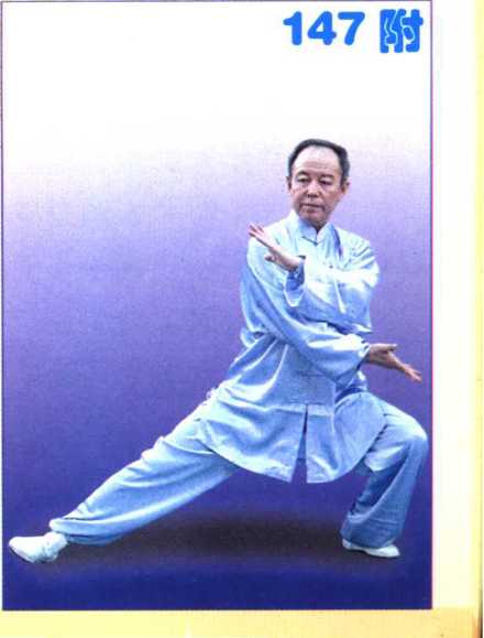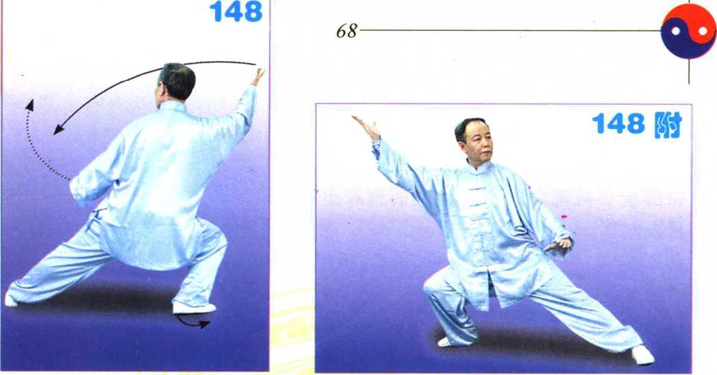 重心右移,上体左转.成右侧弓步(横裆步),右肩向右 倾靠;两掌分别向右前方和左前下方撑开;右掌略高于头,掌 心斜向上,左掌与胯同高,掌心斜向下;目随左掌。(图148)