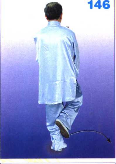 上体微右转,右脚向右侧开步,脚 跟着地;目视左掌。(图147)